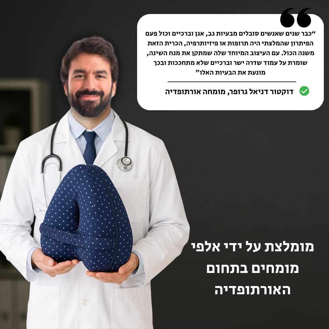 "סוף סוף מוצר שלא מרגיש כמו עוד בזבוז של כסף, הוצאתי אלפי שקלים על תרופות וטיפולים לגב שלי, אבל הכרית הזאת שינתה הכול, גם חסכתי כסף וגם פתרתי את כאבי הגב שלי"