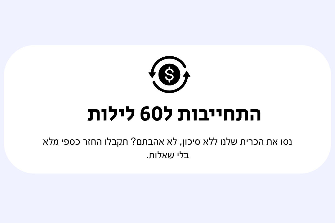 60 לילות ניסיון עם אחריות להחזר מלא!