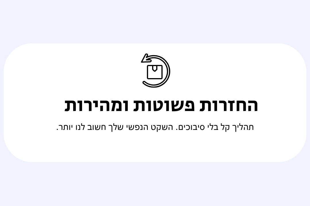 ואם מכל סיבה לא היית מרוצה – אנחנו מציעים גם אפשרות להחזר כספי תוך 60 יום מרגע קבלת המוצר כמובן בכפוף לתנאי השימוש
