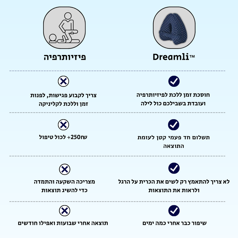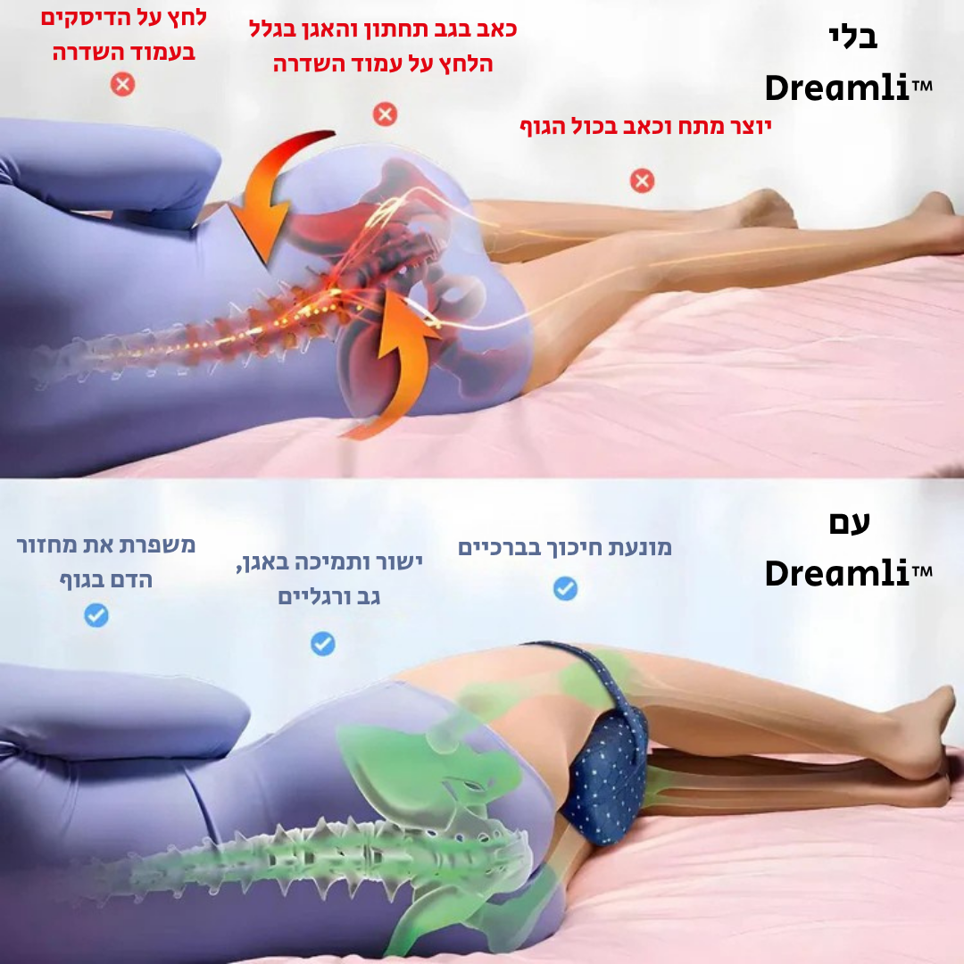 ברגע שתכניסו את ™Dreamli בין הרגליים, היא תטפל בבעיה מהבסיס ותעזור לתקן את תנוחת השינה שלכם.